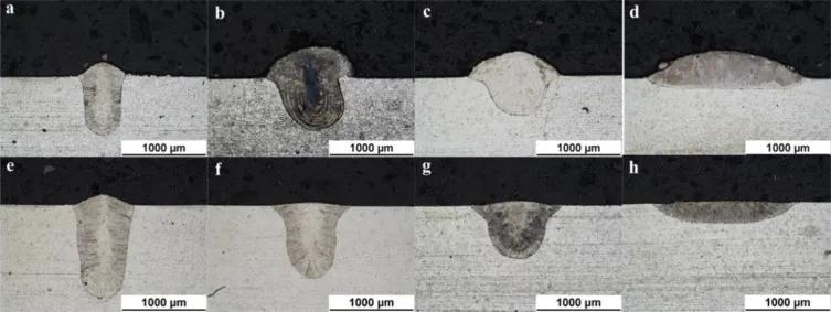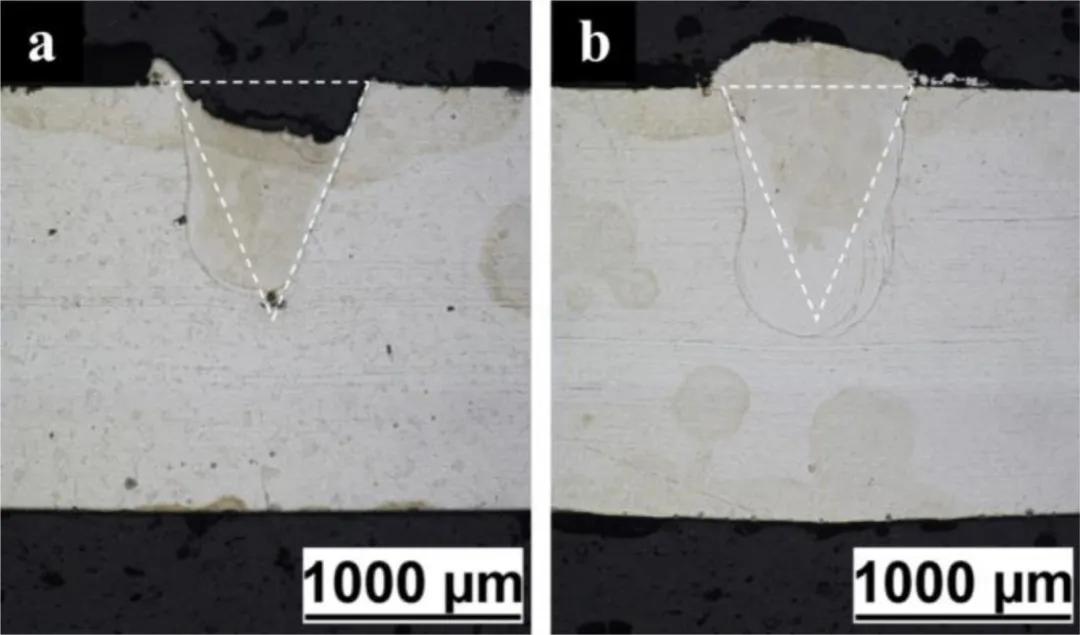 選擇填充凹槽的工藝參數(shù)不僅可實現(xiàn)“V形”熔融區(qū),還使獲得傳導(dǎo)模式成為可能,從而避免了孔隙缺陷。從圖中可以發(fā)現(xiàn)利用兩個重疊的焊道獲得了更好的凹槽填充——填充材料和基材之間形成了良好粘合。