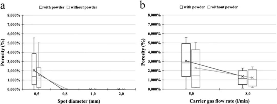 此外,載氣流速對孔隙率的影響如圖3(b)所示。根據(jù)方差分析結(jié)果(P值= 0.001),載氣流速影響最終孔隙率。載氣流速從5升/分鐘增加到8升/分鐘導(dǎo)致總孔隙率降低。無論有無粉末,這種趨勢都是一樣的。其原因在于高載氣流速不僅將粉末送至工件上,而且保護焊接區(qū)域免受空氣氣體的侵入。