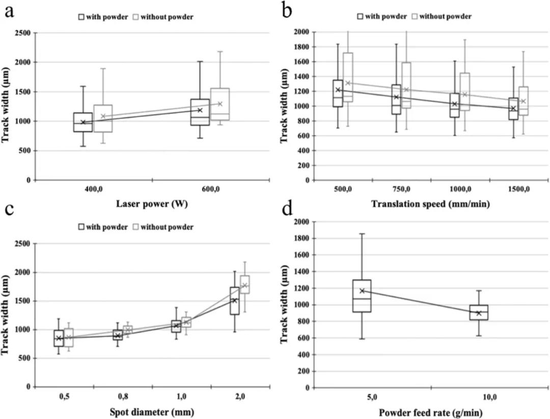從上面的公式,可以明晰光斑尺寸的增加導(dǎo)致了相互作用時間的增加,并因此導(dǎo)致了襯底上加熱時間的延長。圖2(a)展示了焊道寬度是如何隨著激光功率而變化的。如方差分析所示(表1),激光功率對軌道寬度有顯著影響。從圖2(a)中可以看出,焊道寬度與穿透深度類似,隨著表面上激光功率的增加而增加,這是由于熱輸入的增加導(dǎo)致基底材料的更多熔化。這種變化趨勢在添加或不添加粉末的堆焊道里并無區(qū)別。
