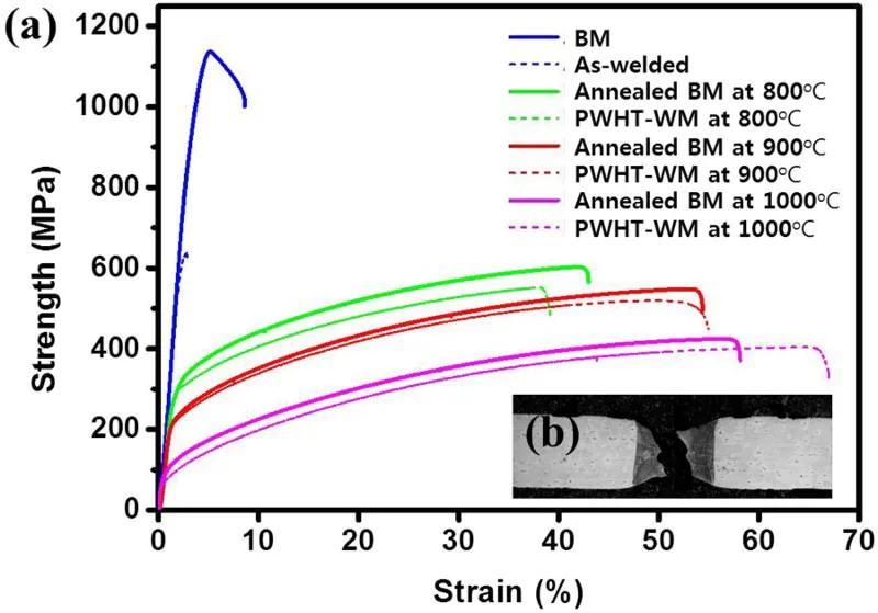 Nam等人顯示CoCrFeMnNiHEA薄片(焊接前同步)的LBW接頭的力學(xué)性能下降。作者將這種退化歸因于顆粒的再結(jié)晶和(可能)焊接條件下通過(guò)焊接熱輸入的“位錯(cuò)團(tuán)的消失”。與焊接條件相比,PWHT在800到1000°C之間對(duì)延性有積極影響。在退火條件下,HEABM和WM在每個(gè)PWHT條件下的強(qiáng)度和延展性是相似的,盡管與初始條件相比,WM伴隨著抗拉強(qiáng)度的顯著損失。