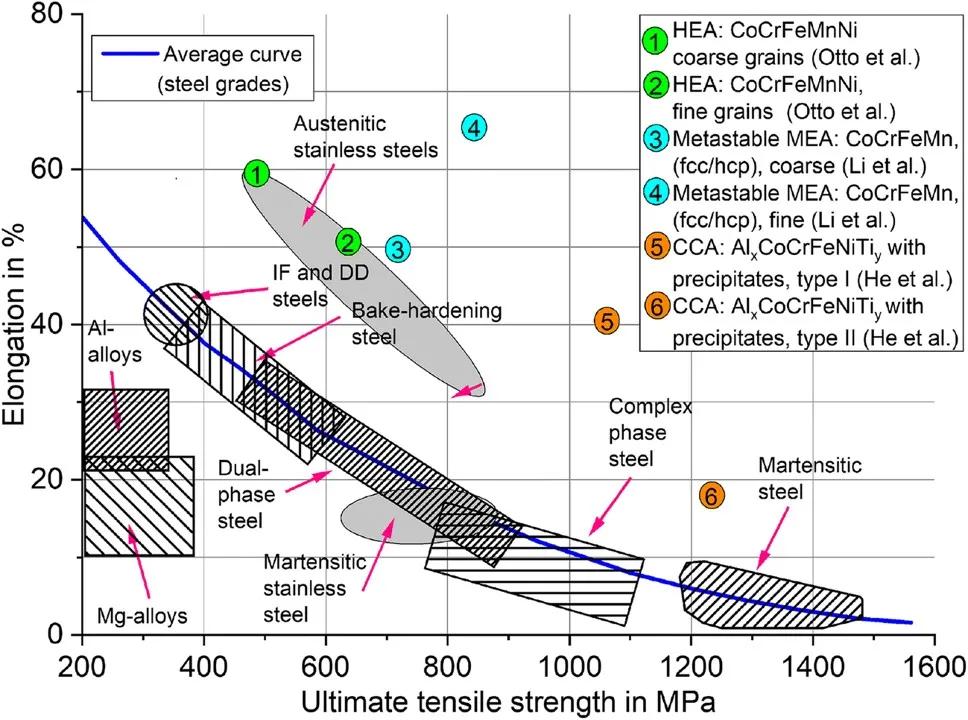 例如,傳統(tǒng)的合金是由冶金的“試錯(cuò)法”誕生的,它由一個(gè)主要元素組成,其中添加少量的合金元素以提高目標(biāo)性能。例如,在鋼或鎳基超合金中的基體元素鐵中加入Cr,以提高強(qiáng)度和耐腐蝕性。銅合金到基礎(chǔ)元素Al,或Al添加到鈦基輕質(zhì)材料中以提高強(qiáng)度。每一種合金都具有典型的性能,如高機(jī)械強(qiáng)度和延性,同時(shí)對(duì)最重要的鋼具有高比重量用于結(jié)構(gòu)強(qiáng)度。另一個(gè)例子是,由于其高強(qiáng)度重量比,鋁和鈦合金使得現(xiàn)代飛機(jī)工業(yè)得以發(fā)展。然而,并不總是有可能用傳統(tǒng)的合金概念來(lái)提高所有的性能(機(jī)械強(qiáng)度、延展性、特定的合金重量、蠕變、耐腐蝕性等),并且必須找到一個(gè)折衷方案。