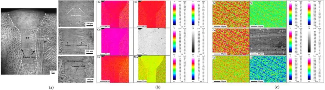 吳等人發(fā)表了一項(xiàng)關(guān)于電子束焊接CoCrFeMnNi的研究(見(jiàn)圖3)。焊縫均未見(jiàn)凝固和液化開(kāi)裂的報(bào)道,這可能與該焊縫的凝固范圍較窄有關(guān)。作者認(rèn)為,CoCrFeMnNi合金在熔焊技術(shù)中具有良好的焊接性。進(jìn)一步的研究證實(shí),在無(wú)缺陷焊接縫方面,良好的焊接性是焊接加工的主要目標(biāo)之一,例如,無(wú)需對(duì)包括LBW和TIG在內(nèi)的各種焊接工藝進(jìn)行進(jìn)一步預(yù)熱。所有這些研究都表明,在樹(shù)突狀凝固過(guò)程中,顆粒從熔合線向焊縫中心線的外延(和部分過(guò)度)生長(zhǎng)(見(jiàn)圖3a)。這種行為是在焊接過(guò)程中施加的熱輸入的結(jié)果,即影響焊縫池形狀的焊接參數(shù)。根據(jù)參考文獻(xiàn),CoCrFeMnNi的EB和TIGWM顯示出樹(shù)突狀凝固,富含Co、Cr和Fe的樹(shù)突狀核,以及富含Ni和Mn的樹(shù)突狀間區(qū)域(見(jiàn)圖3b)。這種元素的微分離可能會(huì)影響CoCrFeMnNiHEA的熱裂化行為,但這到目前為止尚未進(jìn)行研究。