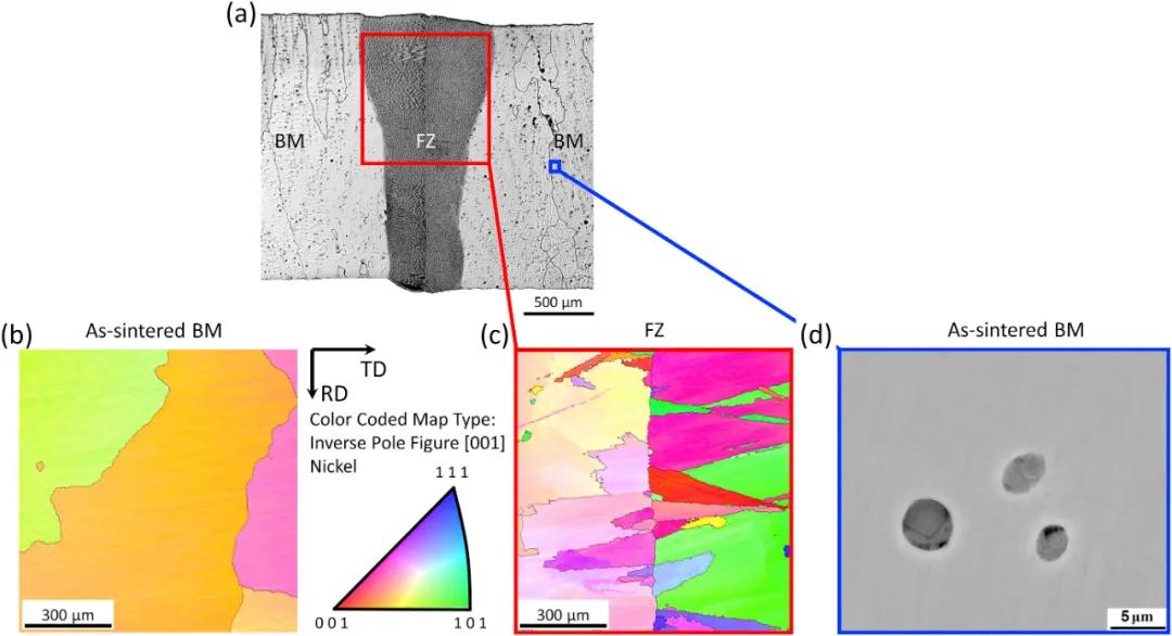 ▲圖6 (a) 激光焊接接頭及其EBSD分析得到的IPF圖, (b)沉積態(tài)和(c) 焊接接頭的熔化區(qū), (d)沉積態(tài)的基材中的MnS夾雜物的 SEM-BSE 圖像