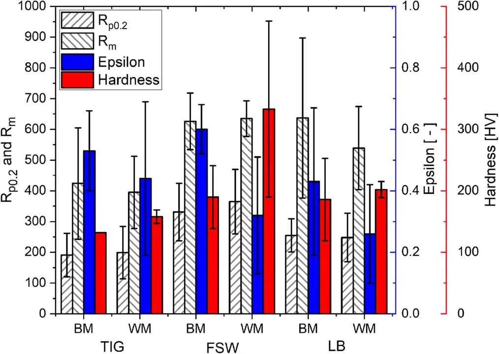 圖4中總結(jié)了不同焊接工藝對(duì)CoCrFeMnNiHEA力學(xué)性能的影響。對(duì)不同焊接工藝的屈服強(qiáng)度(Rp0.2)、抗拉強(qiáng)度(RM)、斷裂伸長(zhǎng)率(ε)和WM的平均值進(jìn)行比較:與焊接條件相比,TIG和LBW(FSW稍后討論)、RM和ε降低,同時(shí)硬度增加。這與機(jī)械性能的下降相對(duì)應(yīng),這主要反映在延性的降低,也可能是WM的韌性,即對(duì)阻力的降低。與BM相比,裂紋增長(zhǎng)。在這方面,發(fā)生的焊接殘余應(yīng)力與使用的焊接熱輸入是重要的,應(yīng)該在未來(lái)的研究中進(jìn)行研究。Wu等人認(rèn)為,與焊接接頭相比,焊接接頭的力學(xué)性能下降對(duì)WM中粒徑和元素分離產(chǎn)生影響。