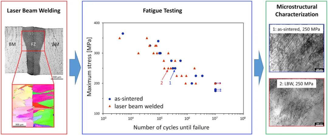 圖6表明,CoCrFeNi類型的高熵合金可以成功的采用激光束來(lái)進(jìn)行焊接;析出的碳化物造成熔化區(qū)的硬化;燒結(jié)狀態(tài)和焊接的合金具有相似的靜態(tài)力學(xué)性能和疲勞性能;疲勞斷裂主要發(fā)生在基體材料的區(qū)域中。