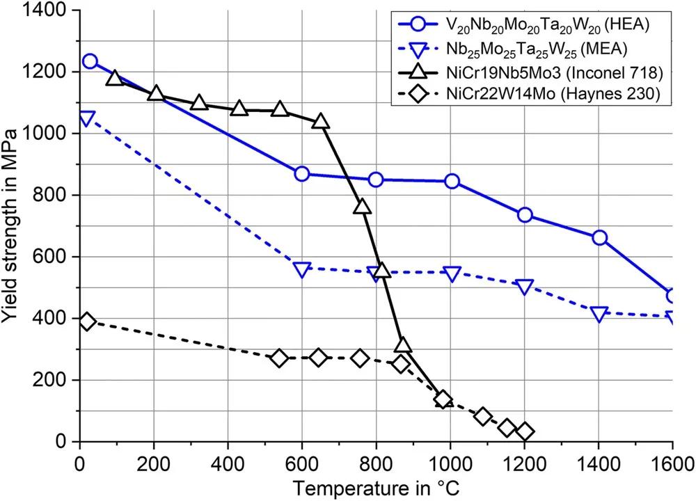 ▲圖 2 難熔高熵合金和中熵合金的高溫屈服強(qiáng)度同傳統(tǒng)的抗蠕變Ni基高溫合金的比較