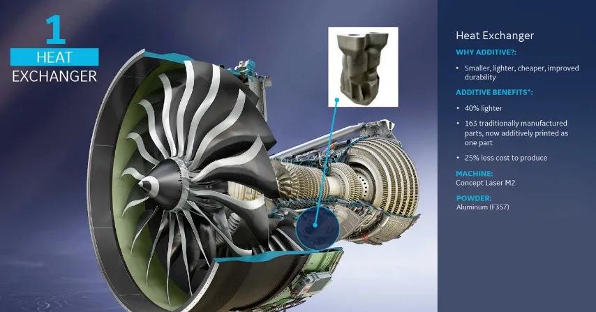 每臺(tái)GE9X發(fā)動(dòng)機(jī)安裝有1個(gè)熱交換器,由鋁合金3D打印而成。熱交換器是由原來(lái)的163個(gè)零件整合設(shè)計(jì)為一個(gè),重量減輕了40%,生產(chǎn)成本減少25%,并提高了使用壽命。