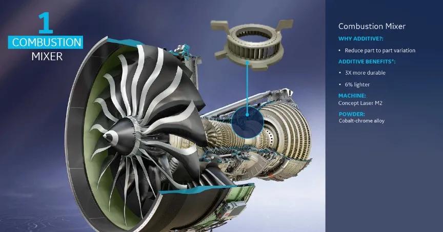 每個(gè)GE9X發(fā)動(dòng)機(jī)有1個(gè)燃燒室混合器,由鈷鉻合金3D打印而成。采用3D打印技術(shù)的燃燒室混合器可以減少6%的重量,使用壽命提高了3倍,同時(shí)減少了零件間的差異。