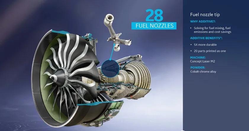 GE9X擁有如此出色的效能,對(duì)3D打印技術(shù)的加持有很大關(guān)系。GE9X上應(yīng)用了304個(gè)3D打印零件,其中包括燃油噴嘴、低壓渦輪葉片、T25傳感器外殼、燃燒室混合器、導(dǎo)流器以及熱交換器。