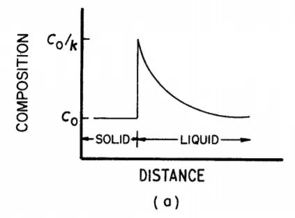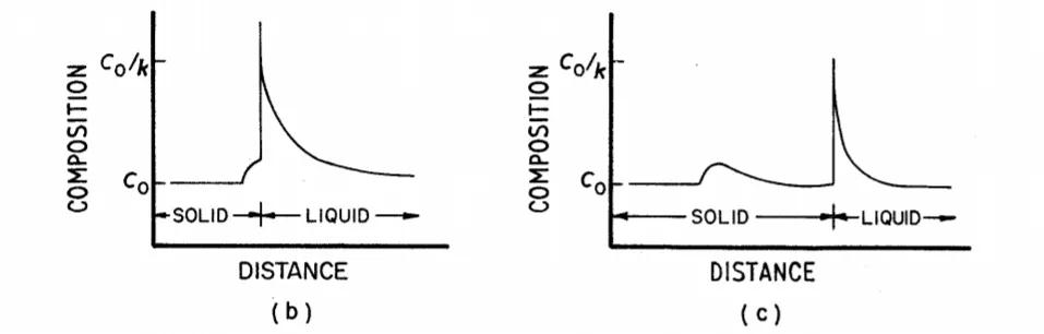 凝固速度增加導(dǎo)致富溶質(zhì)帶形成的示意圖。Co為標(biāo)稱合金成分,k為平衡分配比。(a) 在R~處的穩(wěn)態(tài)凝固,(b)生長速率從R~增加到R 2,(c)在R 2處的穩(wěn)態(tài)凝固(經(jīng)過Flemings之后)