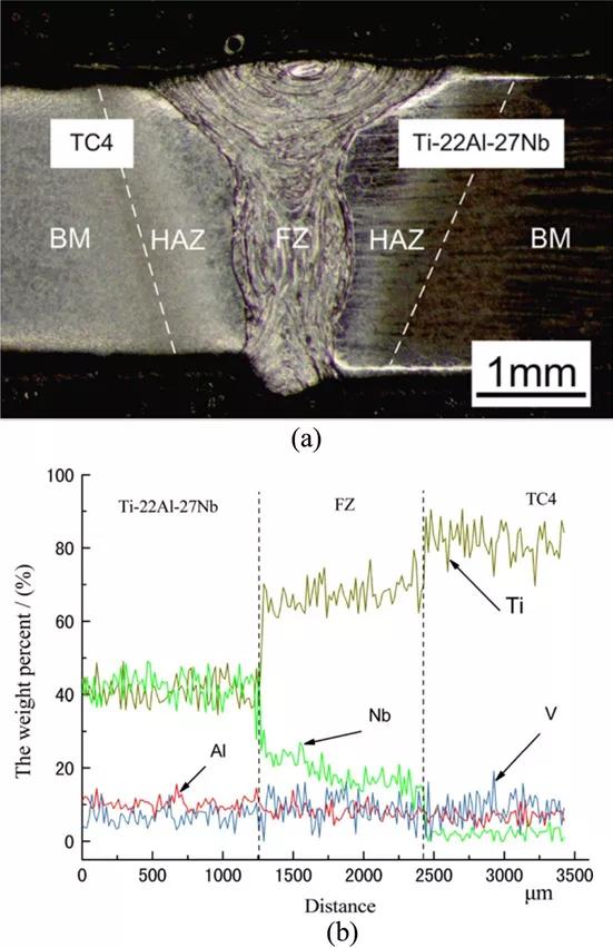 然而,就長期服務(wù)提供而言,結(jié)構(gòu)完整性可能會(huì)受到影響。特別是,異種合金的焊接可能會(huì)導(dǎo)致焊接接頭界面處的不相容問題,因?yàn)椴牧咸匦圆煌?,如?dǎo)熱系數(shù)、熱膨脹和彈性模量。對(duì)于Ti-6-4/Ti-22Al-27Nb焊接接頭,不同材料的上述性能差異導(dǎo)致元素分布發(fā)生顯著變化,如圖1所示。觀察到元素向基底金屬(BM)區(qū)域的擴(kuò)散很??;但是,熔化區(qū)域受到顯著影響。