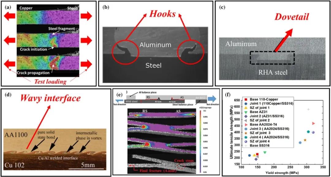 與連接類似材料不同,連接不同材料在機(jī)械載荷期間面臨應(yīng)力集中(彈性模量失配導(dǎo)致的應(yīng)力局部化)的固有問(wèn)題。在銅/鋼接頭(圖11a)和鋁/鋼接頭的拉伸試驗(yàn)期間觀察到應(yīng)力集中。減少早期應(yīng)力集中的有效方法是通過(guò)改變焊接界面的幾何形狀來(lái)重新分配載荷。研究人員引入了機(jī)械聯(lián)鎖特性,如掛鉤或燕尾榫或波浪形金相界面或過(guò)渡區(qū),以提高異種接頭的強(qiáng)度。摩擦攪拌劃線技術(shù)、摩擦攪拌燕尾榫技術(shù)和沖擊焊接的接頭截面分別如圖11b–d所示。吊鉤通過(guò)防止裂紋穿過(guò)焊接界面來(lái)提高異種接頭強(qiáng)度,如圖11e所示。焊縫熔核的局部強(qiáng)度也極大地影響接頭強(qiáng)度,如圖11f所示?;谶@些研究,攪拌摩擦劃線技術(shù)和攪拌摩擦燕尾榫技術(shù)顯示了獲得鎂合金/鋼接頭的潛力。除了在不同材料之間添加夾層外,研究人員還可以應(yīng)用摩擦堆焊等技術(shù)來(lái)輔助鎂/鋼粘合。