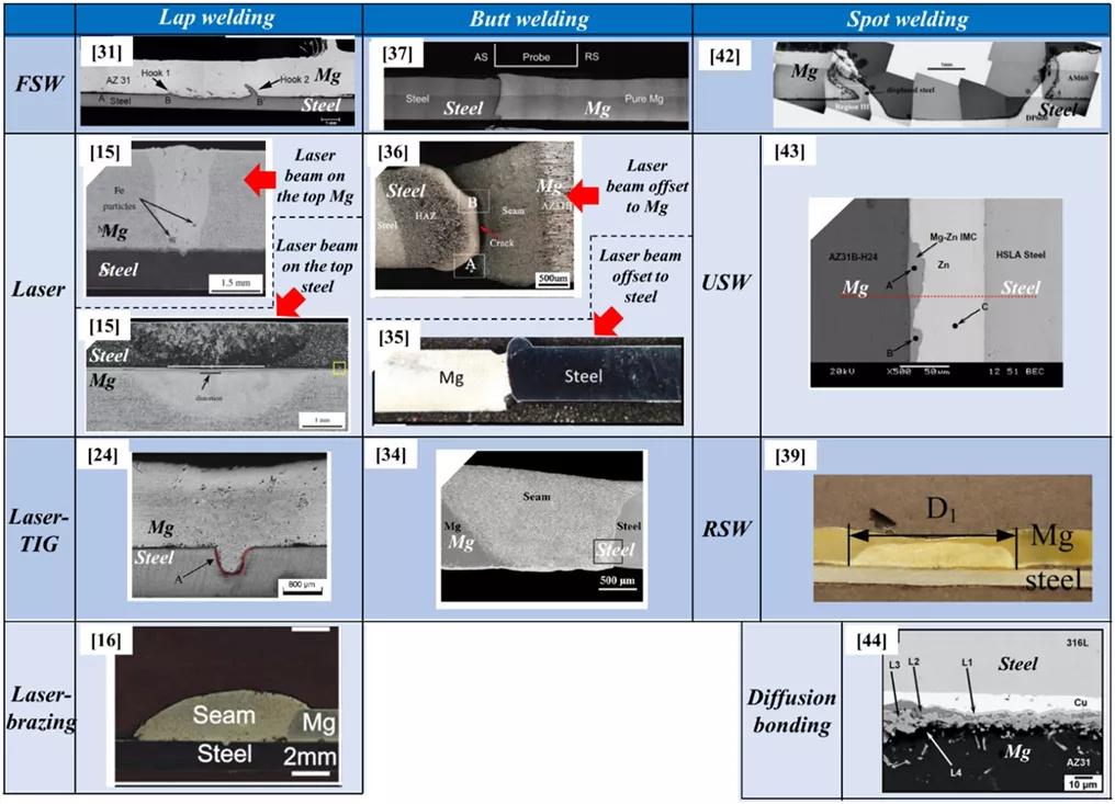 圖4 采用不同的焊接方法制作不同結(jié)構(gòu)的鎂/鋼接頭截面。源參考文獻(xiàn)顯示在括號(hào)中
