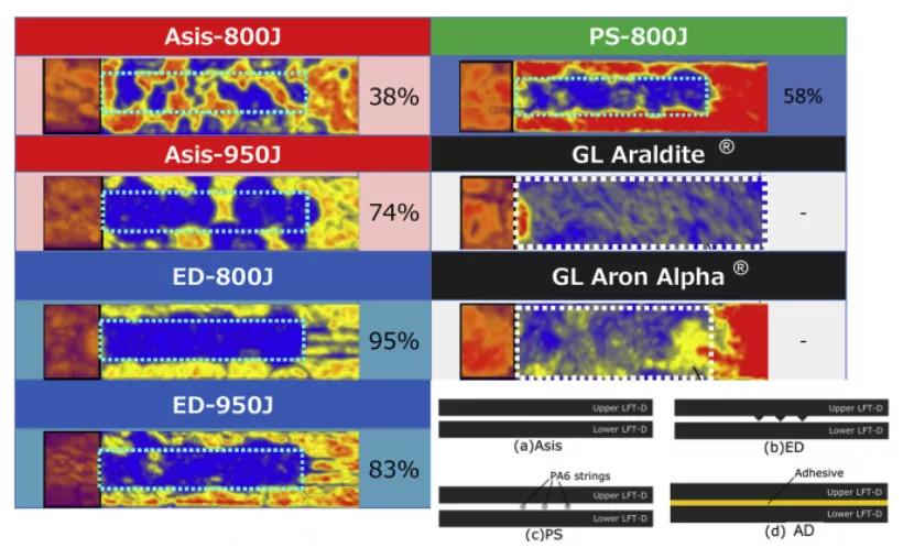 表3顯示了文獻(xiàn)中的搭接拉伸剪切試驗(yàn)數(shù)據(jù)和相應(yīng)的斷裂模式。所有這些試驗(yàn)數(shù)據(jù)都被轉(zhuǎn)換為一個(gè)統(tǒng)一的指標(biāo),稱為“關(guān)節(jié)能力”,以便對(duì)文獻(xiàn)中報(bào)告的各種關(guān)節(jié)配置進(jìn)行定量比較。聯(lián)合能力的計(jì)算是通過(guò)將報(bào)告的峰值負(fù)荷除以樣本的寬度,以提供一個(gè)承載能力的規(guī)范化表示。