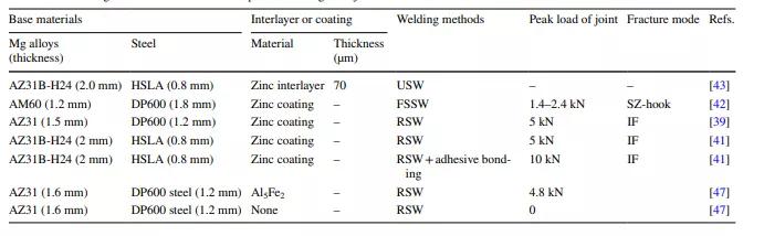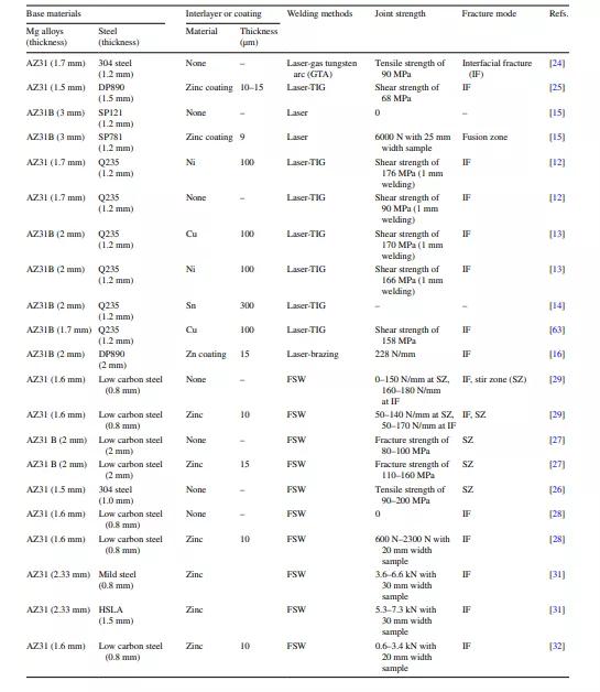 此外,鎂合金和鋼在物理、化學(xué)和機(jī)械性能方面存在巨大差異,這使得傳統(tǒng)的熔合或固態(tài)連接方法變得困難。到目前為止,研究人員已經(jīng)應(yīng)用了不同的中間層或涂層來(lái)克服鎂和鐵的高溫不溶性。在鋼或基釬料上涂覆鎳、銅、錫或鋅的中間層。目前對(duì)鎂合金與鋼的焊接還沒(méi)有較為全面的研究。本文旨在通過(guò)比較鎂-鋼界面的機(jī)械性能、斷裂模式和顯微組織,對(duì)各種焊接方法、中間層和涂層進(jìn)行綜述。
