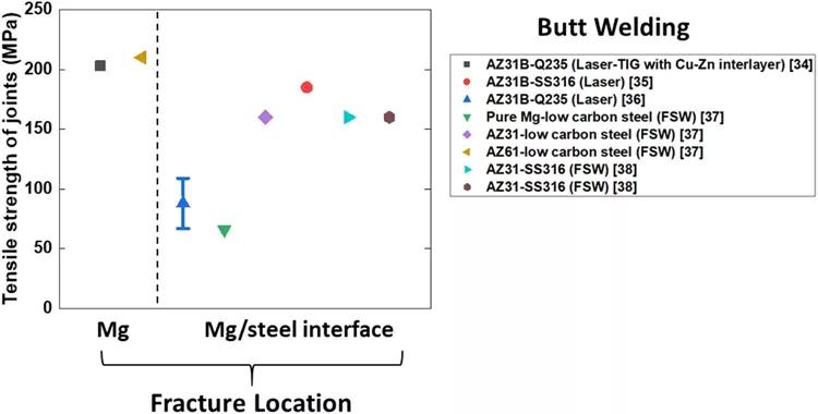 表5總結(jié)了文獻(xiàn)中報(bào)告的對(duì)接焊接頭的抗拉強(qiáng)度和斷裂位置,并繪制了圖7、8和9。注意,鎂/鋼對(duì)接焊接接頭通常通過(guò)焊接界面斷裂。這是因?yàn)镮F處的應(yīng)力集中促進(jìn)了導(dǎo)致斷裂的早期裂紋發(fā)展。在兩種情況下,會(huì)導(dǎo)致鎂合金而非IF中的對(duì)接焊接接頭失效:一是采用Cu–Zn夾層的激光焊接,二是采用AZ61作為鎂合金的攪拌摩擦焊。這兩種情況都降低了鎂/鋼界面處的應(yīng)力集中,從而提高了接頭強(qiáng)度,并使斷裂位置遠(yuǎn)離IF。實(shí)現(xiàn)鎂/鋼對(duì)接焊縫具有更強(qiáng)接口的其他方法包括新型FSW工具引入的聯(lián)鎖功能。