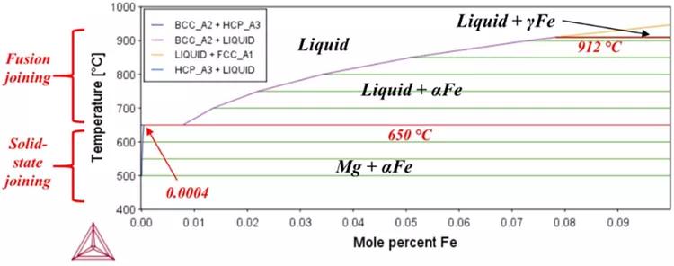 由于鎂合金價(jià)格昂貴,且對(duì)腐蝕的敏感性較高,因此使用鋁合金比鎂合金多。與鎂鋼相比,鋁鋼異種連接的工作量要大得多。雖然在連接不同材料時(shí)常見(jiàn)的障礙適用于鎂-鋼對(duì),但在連接鎂和鋼方面存在一些獨(dú)特的挑戰(zhàn)。首先,鎂和鐵在冶金上幾乎不混溶:鐵在鎂中的溶解度為0.04 at.%,鎂在鐵中的溶解度為零。