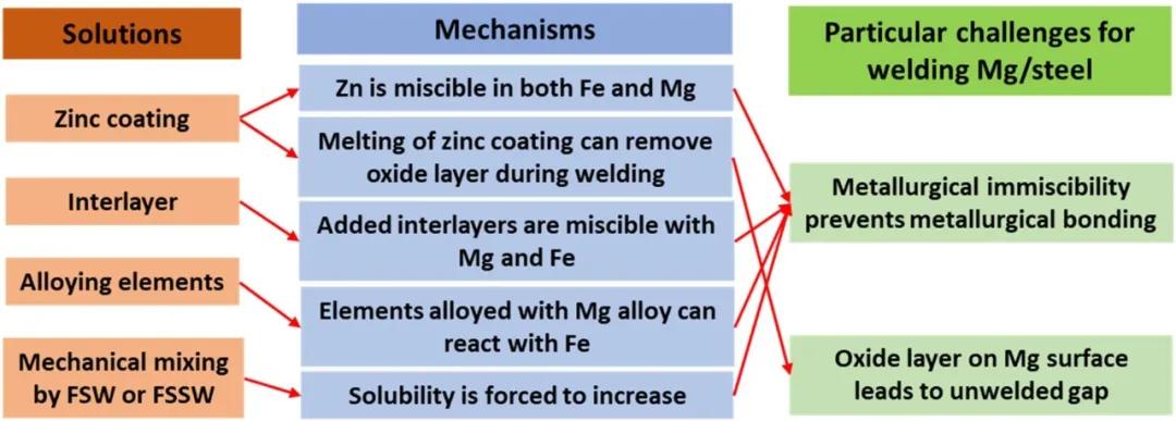 圖10 獲得鎂和鋼之間冶金結(jié)合的挑戰(zhàn)和解決方案示意圖