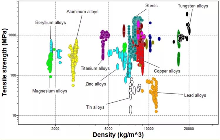 為了實(shí)現(xiàn)這一點(diǎn),研究人員使用了較輕的材料,如鋁合金、鎂合金和碳纖維聚合物復(fù)合材料,以取代部分鋼組件。理想的替代品需要具有較高的強(qiáng)度重量比,并且能夠與現(xiàn)有的鋼構(gòu)件形成堅(jiān)固的接頭。與鋁合金和鎂合金相比,碳纖維聚合物復(fù)合材料具有更高的比強(qiáng)度(斷裂強(qiáng)度/密度),但與金屬相比,其耐高溫性較低。鎂合金似乎是比鋁合金更好的選擇,因?yàn)樗鼛缀鹾弯X合金一樣堅(jiān)固,但比鋁輕33%。各種金屬的強(qiáng)度與密度的關(guān)系如圖1所示。