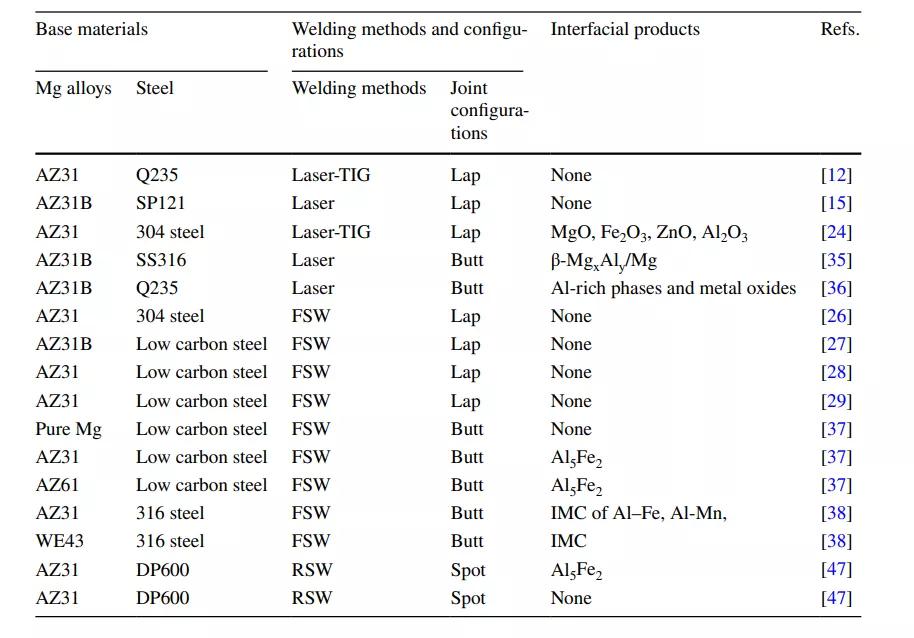 表1和表2分別總結(jié)了焊接鎂/鋼界面上有無(wú)夾層或涂層的界面反應(yīng)產(chǎn)物。根據(jù)表1中總結(jié)的文獻(xiàn),大多數(shù)情況下未觀察到界面產(chǎn)物,但在激光焊接鎂/鋼界面上觀察到金屬氧化物。這是因?yàn)樵谌酆高^(guò)程中容易發(fā)生氧化。金屬間化合物(IMC)出現(xiàn)在FSW-ed鎂和鋼之間的界面上。鎂薄板中的合金元素?cái)U(kuò)散到焊接界面,并與鋼中的鐵反應(yīng)形成各種化合物。例如,AZ31鎂合金中的鋁以及WE43鎂合金中的Y和Nd都可以與鋼中的鐵發(fā)生反應(yīng)。