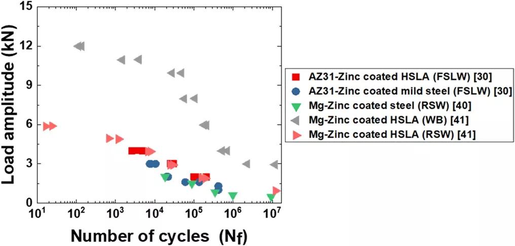 然而,液態(tài)金屬在鎂-鋅電偶中的輔助脆化可能與鎂/鋼焊縫中的裂紋萌生有關(guān)。Xu等人的另一項(xiàng)研究在荷載比R=0.2的循環(huán)荷載模式下,比較了焊接粘結(jié)(WB,結(jié)合RSW和粘合粘結(jié))和RSW Mg/HSLA試樣的性能。研究表明,WB-Mg/Mg和WB-Mg/鋼試樣的疲勞強(qiáng)度比RSW試樣高出三倍。這種改善歸因于WB接頭中的應(yīng)力集中小于RSW接頭中的應(yīng)力集中。此外,鎂/鎂和鎂/鋼疲勞壽命的相似性反映在10 kN荷載下的S–N曲線中。