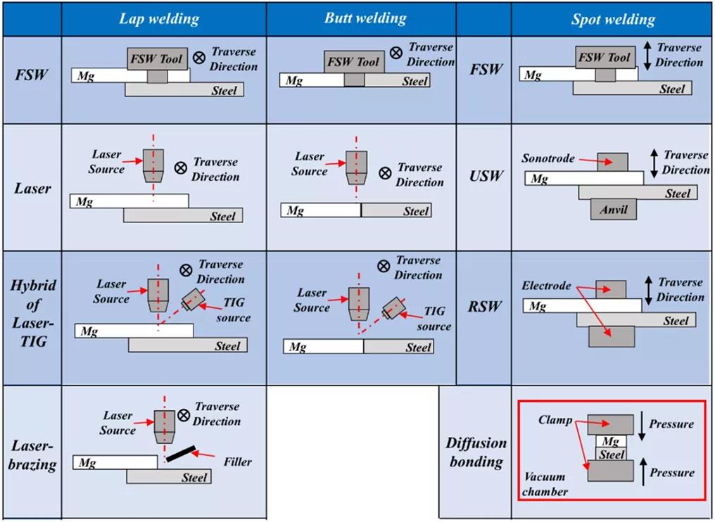 為清楚起見(jiàn),文獻(xiàn)中報(bào)告的接頭配置可分為三大類:線性搭接焊、線性對(duì)接焊和點(diǎn)焊。具有不同接頭配置的各種焊接方法如圖3所示。相關(guān)文獻(xiàn)包括:搭接激光和搭接混合激光TIG、搭接激光釬焊、搭接FSW、對(duì)接激光和對(duì)接混合激光TIG、對(duì)接FSW、spot RSW、spot FSW和spot-USW。擴(kuò)散連接也被用于連接鎂合金和鋼。圖3的示意圖代表了文獻(xiàn)中討論的最典型的焊接配置。
