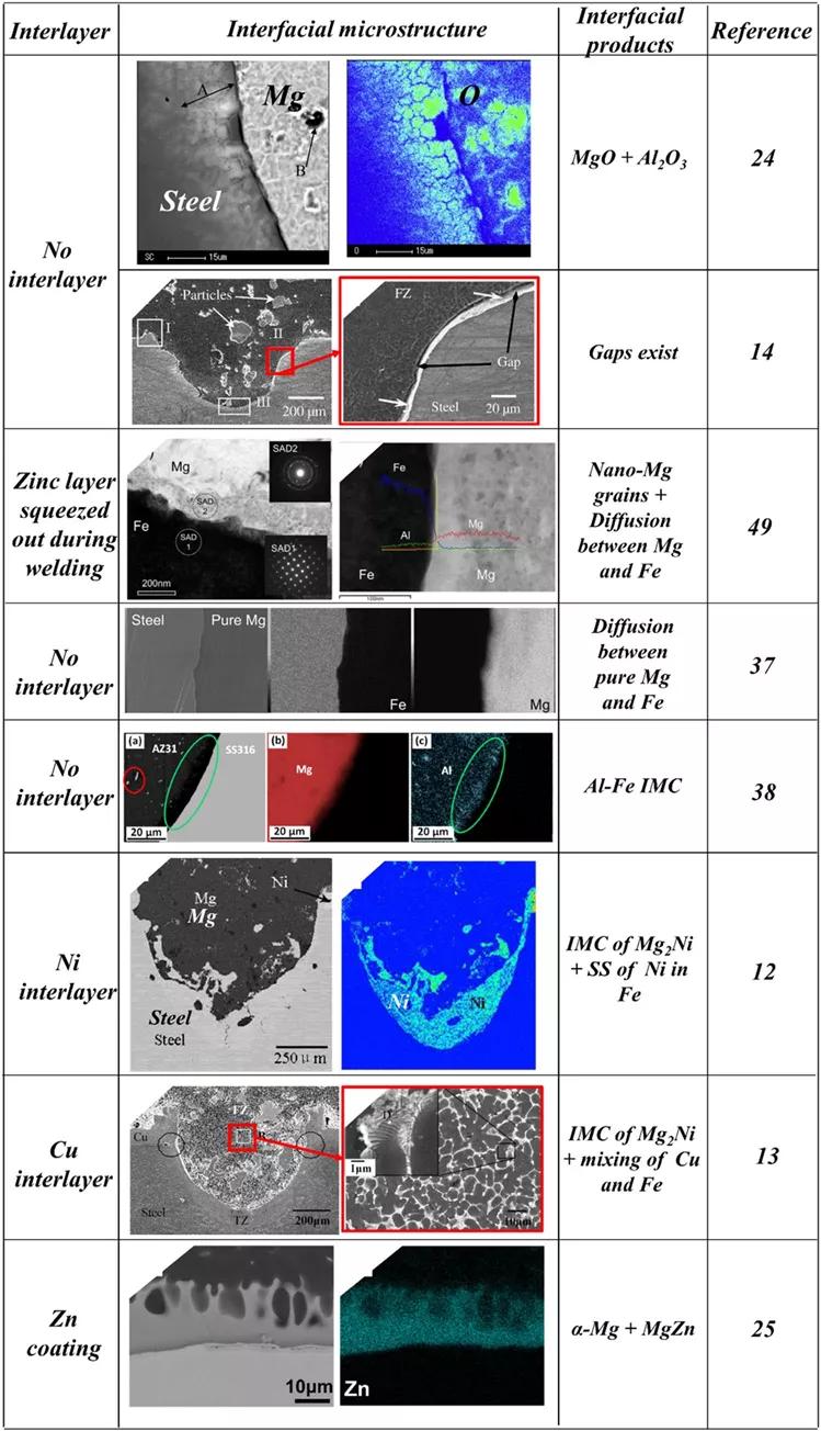 斷裂通常發(fā)生在鋼和Mg/Zn IMC的界面,表明鋼和IMC之間的結(jié)合是最薄弱的環(huán)節(jié)。除鋅鍍層外,在不同的中間層和焊接方法下,觀察到不同的反應(yīng)產(chǎn)物,包括各種固溶體(SSs)和IMC。采用不同的焊接方法使用由Cu、Zn、Cu–Zn、Ni或Sn制成的中間層。表2總結(jié)了界面處文獻(xiàn)中報(bào)告的反應(yīng)產(chǎn)物。一項(xiàng)有趣的研究表明,在純鎂和通過(guò)RSW結(jié)合的鍍鋅無(wú)間隙鋼之間的焊接界面上形成了納米尺寸的鎂顆粒。在RSW過(guò)程中,鋅涂層材料從焊接界面擠出,如焊劑以及表面氧化物污染物,從而改善了接頭性能。圖5列出了焊接鎂/鋼界面上典型報(bào)告的幾種反應(yīng)產(chǎn)物的調(diào)查結(jié)果。