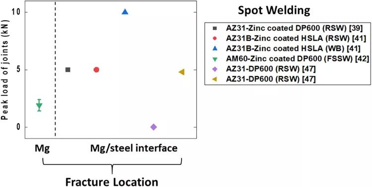 使用該度量進(jìn)行比較的一個(gè)限制是,由于焊接方法的固有差異,不同的搭接焊接接頭具有不同的焊接區(qū)域和形狀。然而,在本研究中,我們?cè)噲D建立不同鎂/鋼接頭的概貌,并承認(rèn)接頭能力只是眾多指標(biāo)之一。因此,在解釋這個(gè)數(shù)據(jù)集時(shí)必須小心。圖6顯示了從文獻(xiàn)中收集的搭接焊接接頭的接頭能力匯總圖。