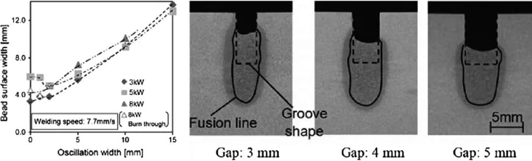 實(shí)驗(yàn)中還研究了激光振蕩焊接及其在窄間隙焊接中的有效性,如圖11所示。通過振蕩激光焊接直接加熱間隙底部附近。然而,一些焊絲碎片可能以固態(tài)形式落入熔池中,導(dǎo)致焊接過程不穩(wěn)定和焊絲成分偏析。當(dāng)激光束振蕩寬度低于間隙寬度時(shí),可通過間隙的上邊緣(試樣前表面)避免激光束干擾?0.5毫米。