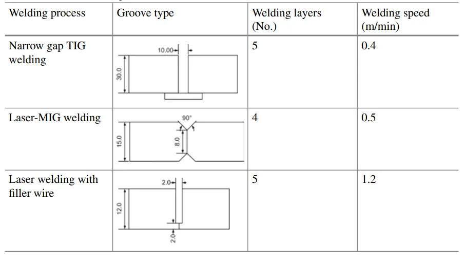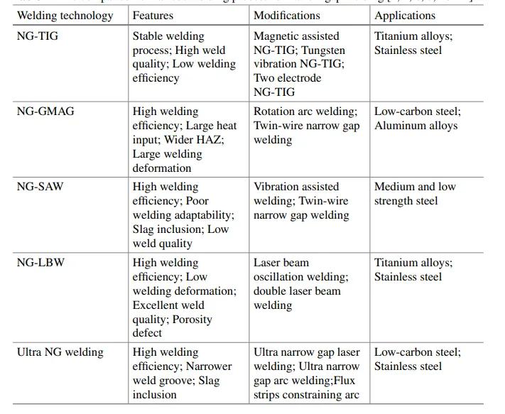 然而,對(duì)于厚焊接結(jié)構(gòu),由于微觀結(jié)構(gòu)的不均勻性,機(jī)械性能可能沿厚度方向發(fā)生顯著變化,并且已證明受所選焊接工藝參數(shù)和實(shí)際接頭幾何形狀的影響。另一方面,高功率電源和真空環(huán)境的要求限制了其實(shí)際應(yīng)用。另一種方法是將低功率電源與填絲窄間隙焊接相結(jié)合,以實(shí)現(xiàn)多層焊接,這可以調(diào)節(jié)焊縫微觀結(jié)構(gòu)并改善接頭性能。該技術(shù)具有成本低、焊接生產(chǎn)率高、焊接熱輸入低等特點(diǎn),被認(rèn)為是最適合厚板焊接的方法。窄間隙焊接的過程控制和缺陷抑制非常嚴(yán)格,以獲得無缺陷接頭。表1比較了厚板焊接各種工藝的焊接特性。