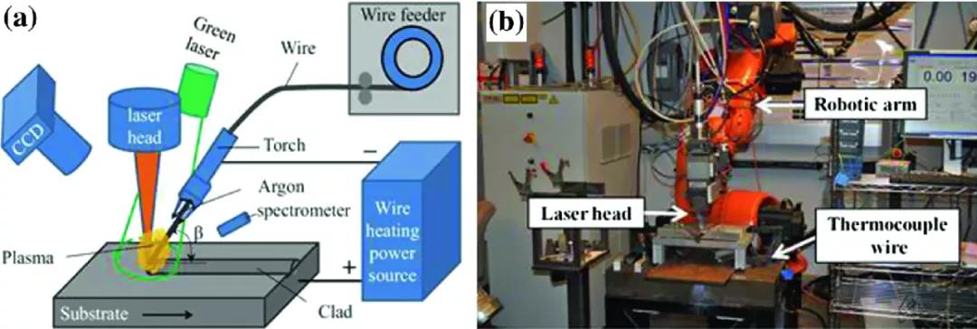 與傳統(tǒng)的弧焊技術(shù)相比,激光熱源在厚板焊接中具有許多優(yōu)點(diǎn),如能量密度集中、焊接速度快、熱影響區(qū)窄、熱變形小。然而,窄間隙激光焊接的一些缺點(diǎn),如激光光斑小、激光與焊絲/電弧的對(duì)準(zhǔn)能力差、焊接飛濺等,也亟待解決。熱絲激光焊接實(shí)驗(yàn)系統(tǒng)如圖8所示。