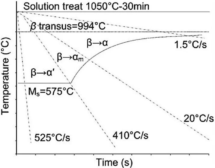 鈦及其合金容易受到大氣污染,并且隨著溫度的升高,晶粒長(zhǎng)大,這兩種情況都會(huì)對(duì)焊接接頭的機(jī)械特性有害。焊接接頭的微觀結(jié)構(gòu)在很大程度上取決于冷卻速度。冷卻速率為525至1.5°C/s?1導(dǎo)致馬氏體相變、塊狀相變和擴(kuò)散相變。410°C以上的冷卻速率?1導(dǎo)致完全馬氏體微觀結(jié)構(gòu),在410和20°C之間觀察到大量相變?1,這種轉(zhuǎn)變逐漸被擴(kuò)散控制的魏氏狀態(tài)所取代,冷卻速率降低,如圖15所示。