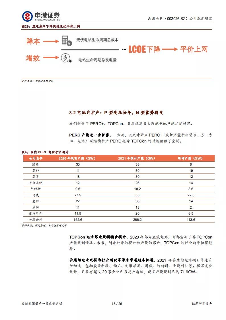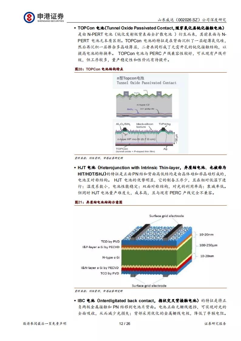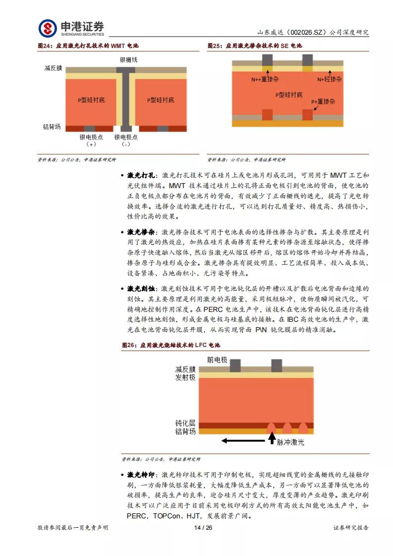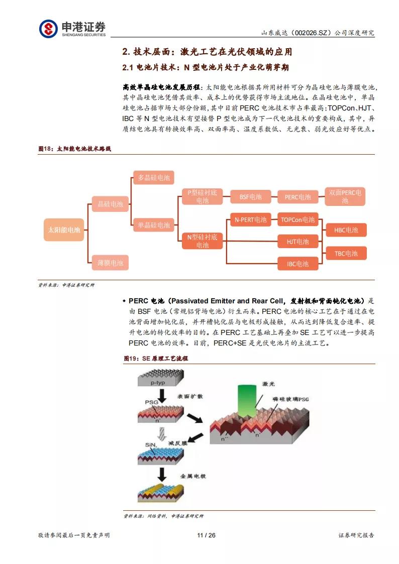 行業(yè)層面:光伏成長空間廣闊激光設(shè)備大有可為。2020 年,我國正式提出力爭在 2030 年前實現(xiàn)碳達峰、在 2060 年前實現(xiàn)碳中和的目標(biāo)。預(yù)計在碳中和的背景下,整個新能源行業(yè)都將進入高速發(fā)展的快車道.. 中國光伏行業(yè)協(xié)會預(yù)計“十四五”期間,中國年均新增裝機有望達 70-90GW,全球有望達 222-287G。我們分別統(tǒng)計了 PERC、TOPCon、異質(zhì)結(jié)電池擴產(chǎn)情況,從商用角度看,P型電池尚在壯年,N 型電池蓄勢待發(fā),公司在 P 型電池時代創(chuàng)造的市占率神話有望在即將到來的 N 型電池時代得以復(fù)制。公司對激光轉(zhuǎn)印相關(guān)技術(shù)進行了多年的研究與開發(fā),目前已完成 PERC 工藝樣機的交付,該技術(shù)在 TOPCon、HJT、 IBC 等電池工藝上均將大有所為。在 TOPCon 電池工藝上,公司擁有激光硼摻雜、特殊漿料開槽等相關(guān)技術(shù)儲備;在 HJT 電池工藝上,公司的 LIA激光修復(fù)技術(shù)已取得客戶量產(chǎn)訂單;在 IBC 電池工藝上,公司的激光開槽技術(shù)已取得量產(chǎn)訂單并確認收入。