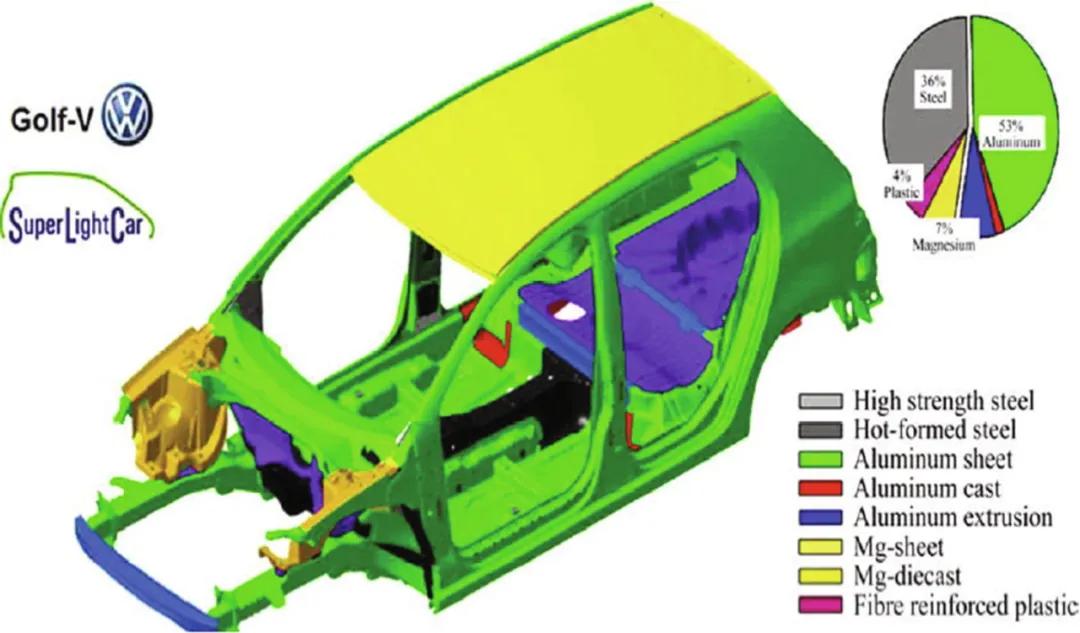汽車工業(yè)中鋁及其合金的發(fā)展已用于車輪、變速器、發(fā)動機和熱交換器的鑄造。最特別的減重范圍是白色車身(白車身)和大量鋁(圖4)。