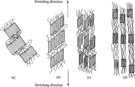 如圖,用x射線衍射、光學(xué)顯微鏡和電子顯微鏡詳細分析了半晶聚合物塑性變形的機理。特別是對聚乙烯單軸變形的情況進行了研究。這種處理僅限于分析由非晶區(qū)連接的球晶的三個相鄰晶片的修飾。