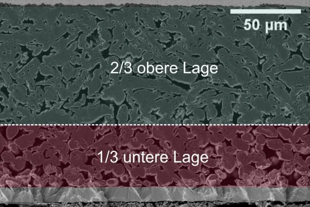 多層電極截面的掃描電子顯微鏡:不同的活性材料用于層,并同時應用。來源:Joyce Schmatz, MaP - Microstructures and Pores GmbH, and JanaKumberg, KIT