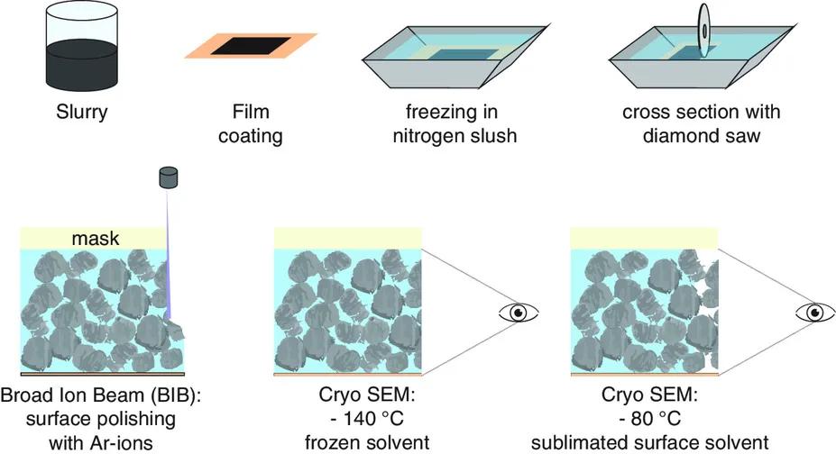 圖5 低溫bib - sem截面的制備過程如圖1所示。漿液被涂上一層,然后直接用氮泥漿凍結。用金剛石鋸和BIB在低溫條件下制備橫截面。在表面毛細管中的溶劑被升華而不改變非揮發(fā)性成分的結構。