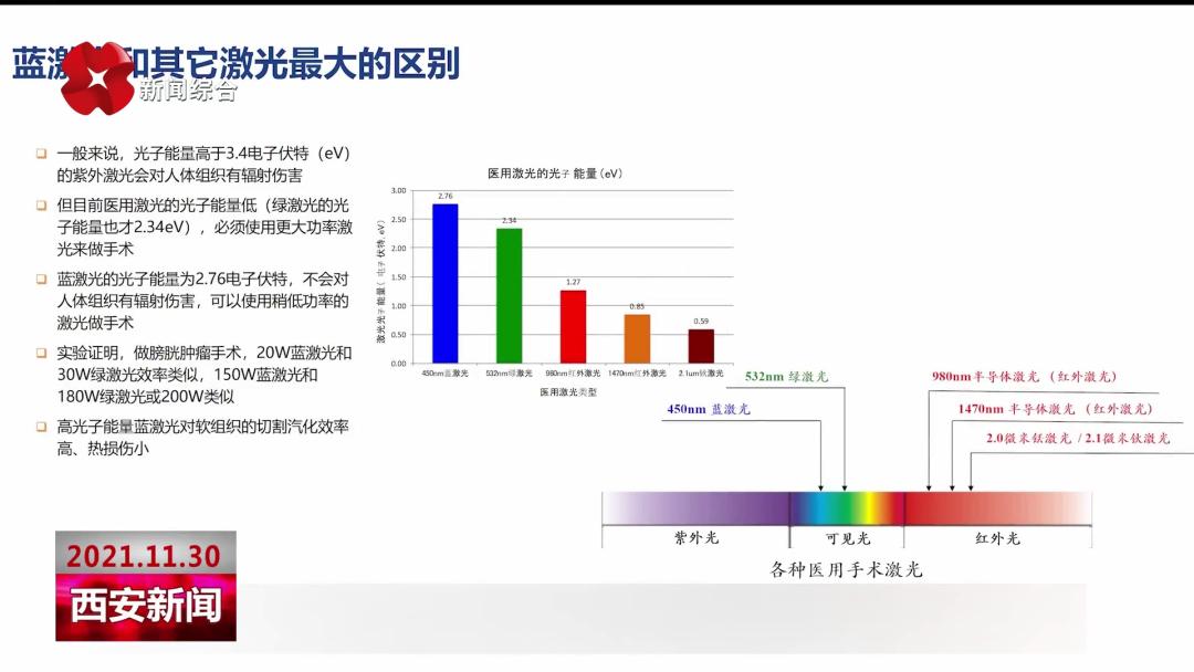 研制成功并投入臨床使用重大突破近日,由西安交通大學(xué)第一附屬醫(yī)院和西安藍(lán)極醫(yī)療電子科技有限公司聯(lián)合研發(fā)的世界首臺輸出功率30W藍(lán)激光手術(shù)設(shè)備正式獲得國家藥品監(jiān)督管理局頒發(fā)的三類醫(yī)療器械注冊證并投入臨床使用,實(shí)現(xiàn)了國產(chǎn)重大醫(yī)療器械在半導(dǎo)體激光領(lǐng)域自研、自制的重大突破。在臨床應(yīng)用上,藍(lán)激光相比于傳統(tǒng)的紅激光、綠激光等,具有汽化效果更快、止血效果更好、對組織熱損傷更小等優(yōu)點(diǎn),而且設(shè)備的體積和噪音更小,更加易于推廣。西安交大一附院泌尿外科賀大林教授團(tuán)隊(duì)基于醫(yī)工結(jié)合的思路,與西安藍(lán)極醫(yī)療首席科學(xué)家穆力越博士合作,歷時五年研發(fā)出世界首臺30W藍(lán)激光手術(shù)設(shè)備,該設(shè)備切除效率高、噪聲小、可視性好,無閉孔神經(jīng)反射、術(shù)中無任何出血,無碳化組織,有利于傷口快速愈合,解決了激光治療領(lǐng)域“臨門一腳”的難題。截至目前,西安交大一附院已利用該設(shè)備成功實(shí)施兩例手術(shù)。下一步,研發(fā)團(tuán)隊(duì)還將研發(fā)200W藍(lán)激光設(shè)備,并將藍(lán)激光設(shè)備逐步推廣應(yīng)用到消化科、婦科、耳鼻喉科、呼吸科和口腔科等領(lǐng)域的疾病治療,同時,推進(jìn)藍(lán)激光技術(shù)培訓(xùn)和相關(guān)領(lǐng)域人才培養(yǎng),將設(shè)備推廣應(yīng)用到基層醫(yī)療機(jī)構(gòu)。“長安號”微信公眾號