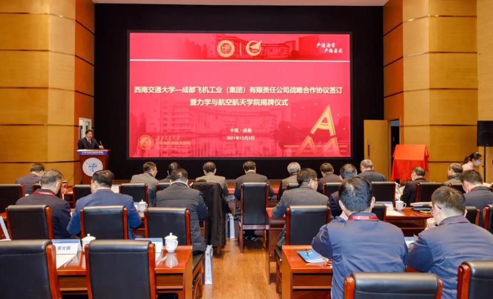 12月3日上午,西南交通大學(xué)與成都飛機工業(yè)(集團)有限責(zé)任公司戰(zhàn)略合作協(xié)議簽訂暨力學(xué)與航空航天學(xué)院揭牌儀式在犀浦校區(qū)舉行。