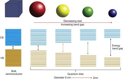 量子點(diǎn)的電子特性介于塊狀半導(dǎo)體和孤立分子。光電特性是由它們的大小和形狀決定的,并隨著這些變量的變化而變化。例如,當(dāng)量子點(diǎn)被一個(gè)能量光子hν(其中,ν是入射光子的頻率)激發(fā)時(shí),那些相對較大的尺寸,在大約5-6納米,發(fā)射橙色或紅色波長的能量。較小的量子點(diǎn)發(fā)射出藍(lán)色或綠色范圍內(nèi)較短的波長。因此,可以通過改變網(wǎng)點(diǎn)大小和形狀來調(diào)整這些屬性以獲得所需的輸出。圖3.3顯示了量子點(diǎn)的帶隙隨尺寸變化的變化情況。量子點(diǎn)可以由單元素材料(如硅或鍺)或化合物半導(dǎo)體(如CdSe、PbSe、CdTe和PbS)制成。量子點(diǎn)有時(shí)也被稱為“人工原子”,因?yàn)檫@些材料表現(xiàn)出在原子和分子中可見的離散電子態(tài)。