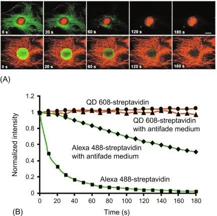 量子點(diǎn)和Alexa 488之間的光穩(wěn)定性比較。(A)頂行:在3T3細(xì)胞中,用QD 630鏈霉親和素(紅色)標(biāo)記核抗原,同時(shí)用結(jié)合抗鼠IgG(綠色)的Alexa 488標(biāo)記微管。底層:微管用QD 630鏈霉親和素(紅色)標(biāo)記,核抗原用與抗人IgG結(jié)合的Alexa 488染色為綠色。在100×1.30油浸物鏡下,用100 W汞燈連續(xù)照亮試樣3分鐘。使用激發(fā)濾波器(ex 485±20 nm)激發(fā)Alexa 488和QD 630。使用電動濾輪上的發(fā)射濾波器em 535±10 nm和em 635±10 nm分別采集Alexa 488和QD 630信號。每種顏色的圖像都是用冷卻的CCD相機(jī)以10秒的間隔自動拍攝的。顯示0、20、60、120和180秒時(shí)的圖像。Alexa 488的標(biāo)記信號迅速消失,在2分鐘內(nèi)無法檢測到,而QD 630的信號在整個(gè)3分鐘的光照期間沒有明顯變化。比例尺,10μm。(B)使用裝有甘油或antifade安裝介質(zhì)Vectashield的標(biāo)本,定量分析QD 608鏈霉親和素(染色微管)和Alexa 488鏈霉親和素(染色核抗原)強(qiáng)度的變化。圖像由X. Wu, H. Liu, J. Liu, K.N. Haley, J.A. Treadway, J.P. Larson, N.Ge, F. Peale, M.P. Bruchez,利用半導(dǎo)體量子點(diǎn)對癌癥標(biāo)記物Her2和其他細(xì)胞靶點(diǎn)進(jìn)行免疫熒光標(biāo)記,Nat. biotechno21(1)(2002) 41-46。