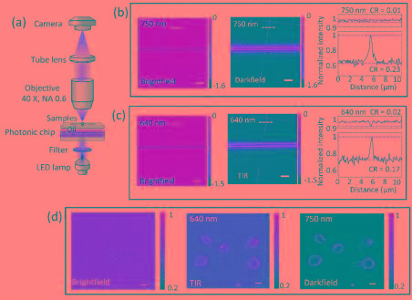 因此,在正入射下,經(jīng)過該光學(xué)薄膜器件的光束出射角度要么是大于一定的角度(對應(yīng)750 nm波長),要么是在薄膜表面產(chǎn)生光學(xué)表面波(對應(yīng)640 nm 波長)。利用一塊光學(xué)薄膜器件,在常規(guī)的明場顯微鏡上(圖2a),可同時實現(xiàn)暗場顯微成像與全內(nèi)反射成像。成像效果如圖2b,2c所示,相對于明場光學(xué)顯微鏡像,其成像對比度有大幅度的提升。該種方法不僅適用于空氣中的樣品,也適用于液體環(huán)境中生物活細(xì)胞的成像,如圖2d所示。