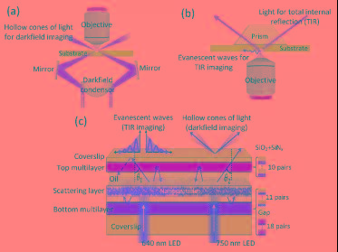 圖1 傳統(tǒng)暗場照明(a)與全內(nèi)反射照明(b)光學(xué)顯微鏡,基于光學(xué)薄膜結(jié)構(gòu)的顯微成像照明元件