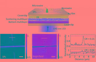 進一步實驗結(jié)果表明,該方法不僅可以實現(xiàn)介質(zhì)薄膜上的表面波,也可用于激發(fā)目前引起廣泛興趣的金屬薄膜表面等離激元,如圖3所示,利用其作為照明光源,實現(xiàn)了一種新的表面等離激元共振顯微鏡架構(gòu),相對于目前廣泛使用的基于油浸物鏡的表面等離激元共振顯微鏡,基于光學(xué)薄膜器件的表面等離激元顯微鏡結(jié)構(gòu)簡單,成本低、操作便利,易于集成。