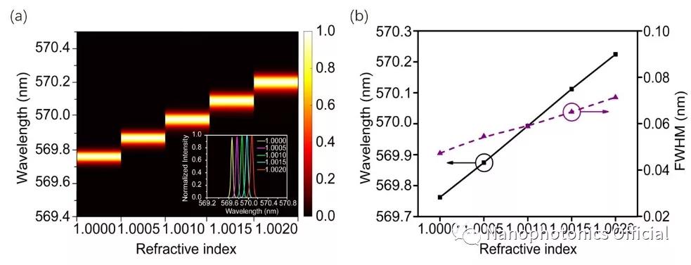 通過改變器件所處的環(huán)境折射率,研究人員進一步對器件的氣敏傳感特性進行了研究。結(jié)果表明器件對環(huán)境的改變有著靈敏的響應,當環(huán)境折射率改變量僅為0.0005時,器件的響應光譜峰位就有著很明顯的移動(圖4a),達到現(xiàn)實普通光譜儀的測量范圍。此外,光譜峰位的移動量和折射率改變量呈線性關(guān)系(圖4b),表明該有源器件對氣體環(huán)境有著良好的檢測功能。由于BIC激光具有非常窄的線寬,計算得到器件傳感靈敏度為221 nm/RIU,品質(zhì)因子高達4420 RIU-1。該指標高出先前報道的無源傳感器品質(zhì)因子一個量級,充分說明該準BIC激光器件在危險氣體檢測方面具有很強的實用價值。