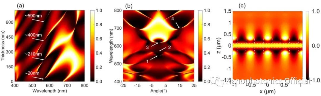 研究人員首先對未加入有機增益的耗散結(jié)構(gòu)進行了系統(tǒng)研究。在光柵寬度T = 230 nm,占空比F = 0.5,周期Λ = 530 nm的條件下,通過改變光柵厚度我們可以看到反射譜在特定的位置出現(xiàn)了不連續(xù)的現(xiàn)象(圖2a)。通過角譜分析,我們發(fā)現(xiàn)該結(jié)構(gòu)中存在多種BIC:對稱保護型BIC,偶然型BIC以及法布里-珀羅型BIC。圖2a中“斷點”對應圖2b中Γ點處模式2。此外,結(jié)合(x, z)平面電場分布,可以發(fā)現(xiàn)大部分能量束縛在由光柵組成的諧振腔內(nèi),進而可以判斷模式2為FP-BIC。對于其機理可以理解為耦合到單個輻射通道的模式在沒有其他損耗的情況下,由于直接傳輸和共振輻射會相互相干相消,進而在諧振頻率附近產(chǎn)生反射。兩個同樣的結(jié)構(gòu)就可以組成一對高反射鏡,進而形成一個法布里-珀羅型微腔。通過調(diào)整高反鏡之間的距離可以使反射波往返的相移為2π的整數(shù)倍,這樣就可以促使法布里-珀羅型BIC 模式的形成。