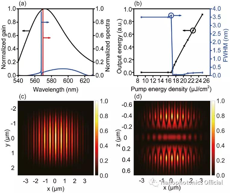 在模式2理想BIC的基礎(chǔ)上,通過改變SiO2厚度獲得準BIC模式。并通過摻入有機增益補償結(jié)構(gòu)內(nèi)在損耗,實現(xiàn)了準BIC模式的激發(fā),形成了BIC激光。圖3為激光激射表征結(jié)果。輸出能量在閾值之上突然和泵浦能量呈線性增長以及光譜線寬的急劇變窄都體現(xiàn)了激光的激射行為。