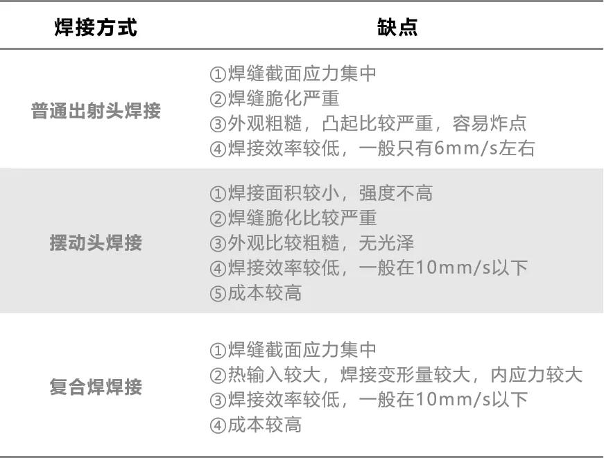 從上表可看出,盡管普通出射頭焊接、擺動(dòng)頭焊接及復(fù)合焊焊接在各自應(yīng)用領(lǐng)域均表現(xiàn)不俗,但用在硅鋼電機(jī)定子焊接上也有其局限性。