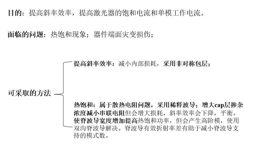 目前的單管半導(dǎo)體激光器的大功率提升主要還是研究如何提升飽和電流,一是增加散熱,二是如何減小半導(dǎo)體激光器的電阻,還有端面災(zāi)變損傷等。如果要設(shè)計(jì),目前考慮到的有,摻雜濃度、非對稱包層、稀釋波導(dǎo)、寬脊波導(dǎo)、電極設(shè)計(jì)電阻、端面鍍膜。當(dāng)然有的電阻小了,斜率效率就會下降,還需要具體優(yōu)化分析,如果要做可以用lastip軟件仿真分析。