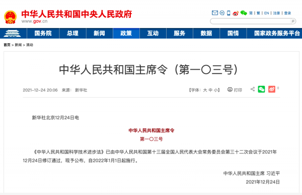 2021年12月24日,中華人民共和國第十三屆全國人民代表大會常務(wù)委員會第三十二次會議修訂通過了《中華人民共和國科學(xué)技術(shù)進步法》(后稱《科學(xué)技術(shù)進步法》)。